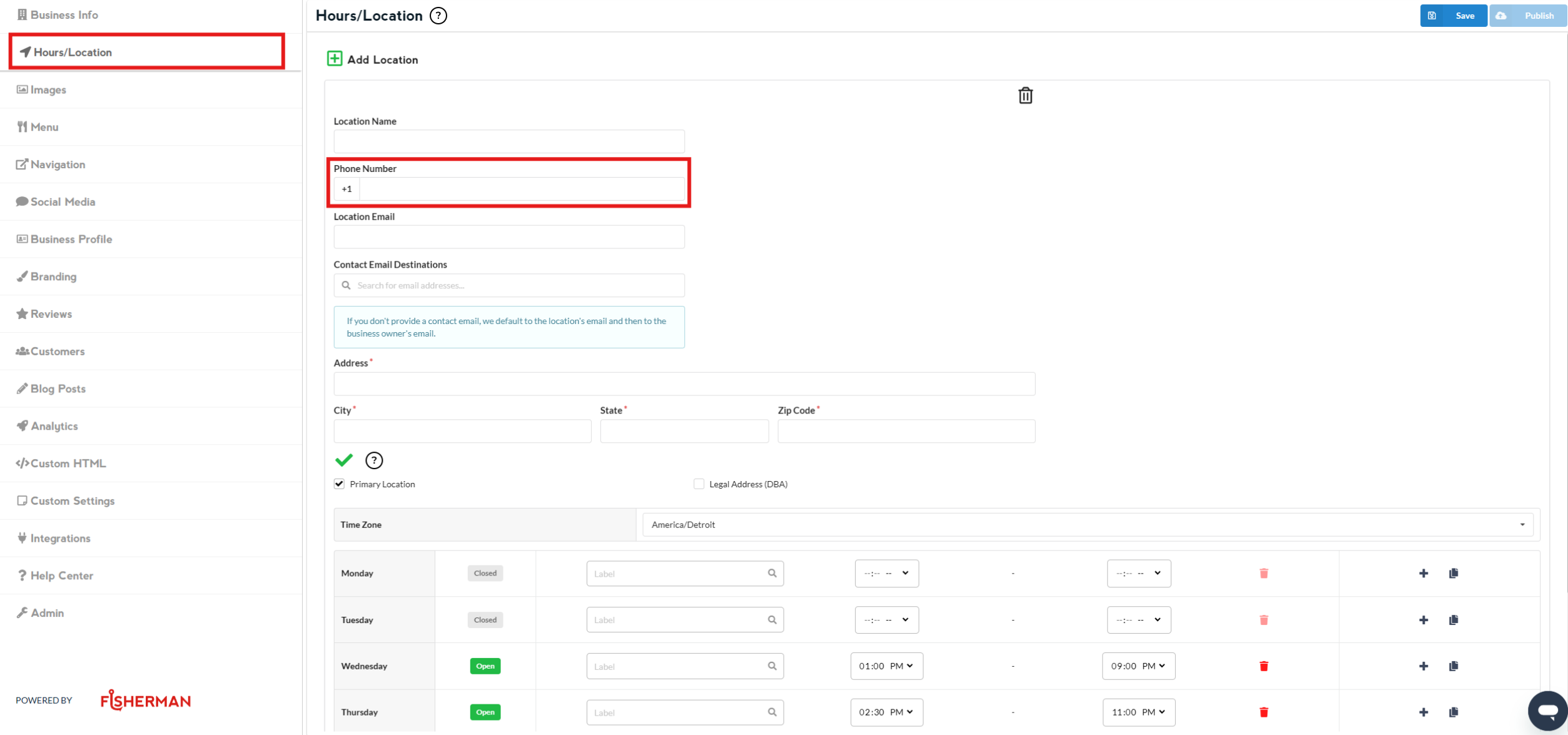 Go to “Hours/Location” section (left side of the dashboard), and there you’ll see a section where you can edit your “Phone Number”