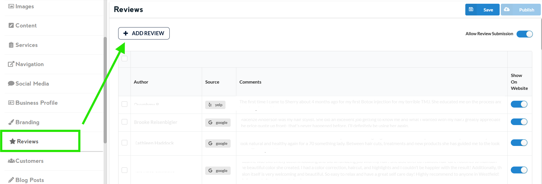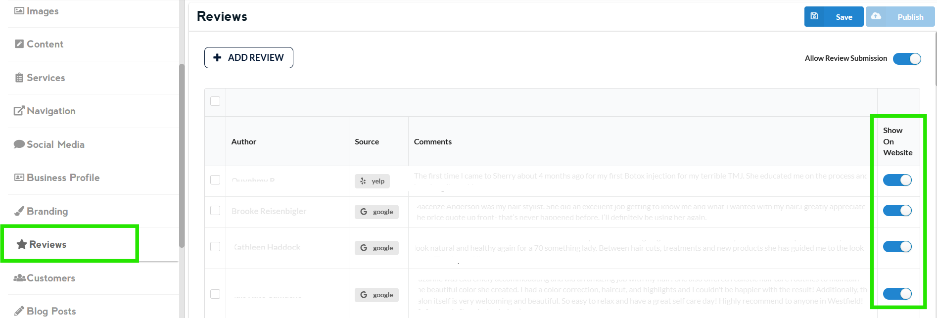 You also have the option to switch between “Show the review on Website” or “Hide the review on Website” just by toggling the switch on the right side of the review