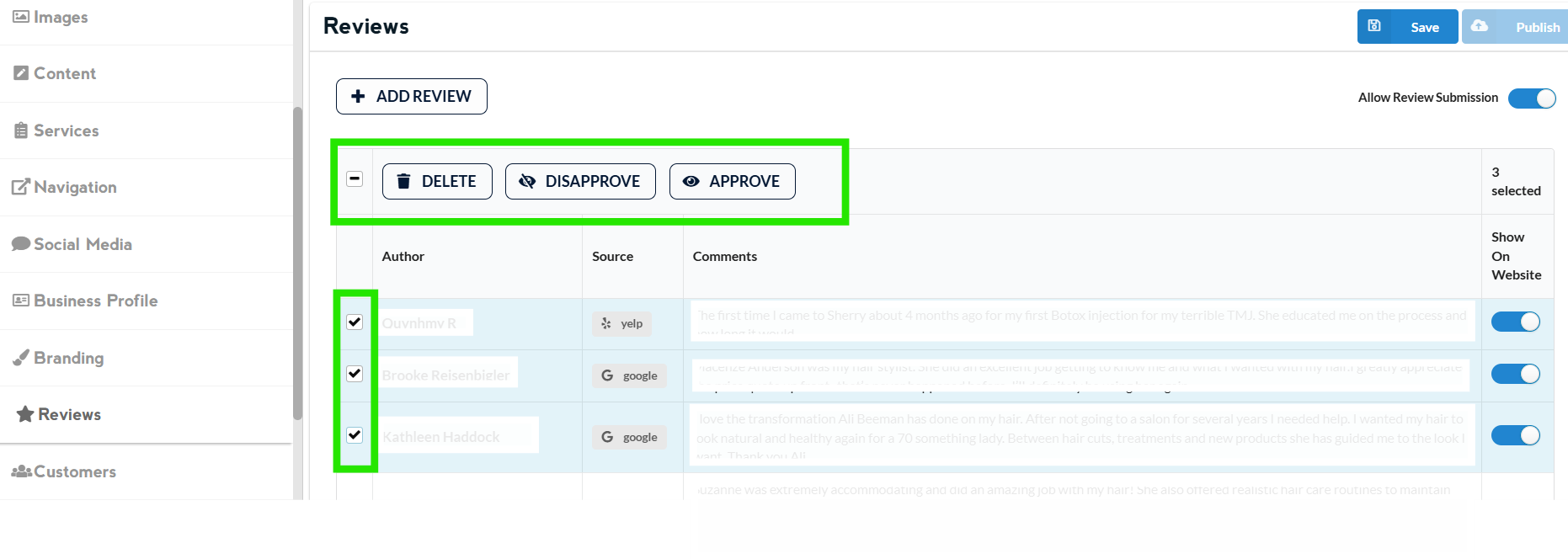 Select the checkbox next to the review you wish to delete, and the “Delete” option will appear above. You also have the option to “Disapprove or Approve” a new review